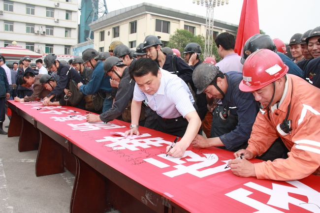 打火庆典上,首选进行了授安全旗仪式,由矿长刘岭向安全副矿长时圣国授安全旗,旗帜上写着今年“安全生产月”活动的主题“强化安全基础,推动安全发展”,寓意认真开展活动,确保安全生产。安全副矿长时圣国带领全体参会人员进行了安全宣誓,参人员举起右手,握紧拳头,庄严宣誓,确保实现安全生产。在启动仪式的最后,全体参会人员在安全生产月条幅上签名,保证安全生产。